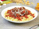 Meatballs, provolone cheese and marinara sauce, sprinkled with parmesan cheese and oregano.
